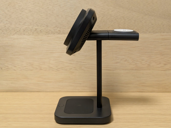 マットな質感のボディは、安っぽさがなく、モダンなデスク周りによく馴染みます。3つの充電部が立体的に配置されているため、設置面積は非常にコンパクトです。これにより、デスク上のスペースを大幅に節約できます。