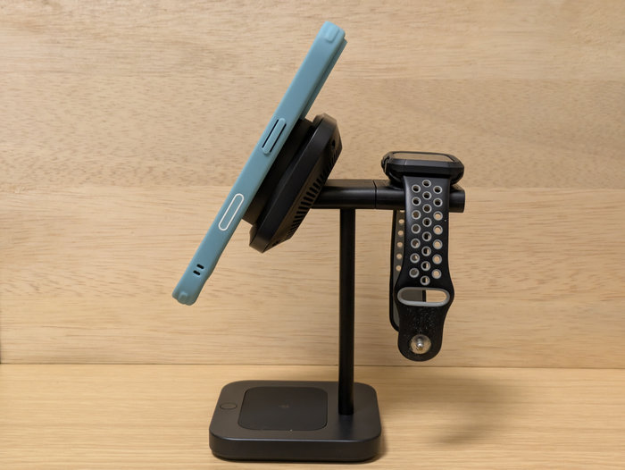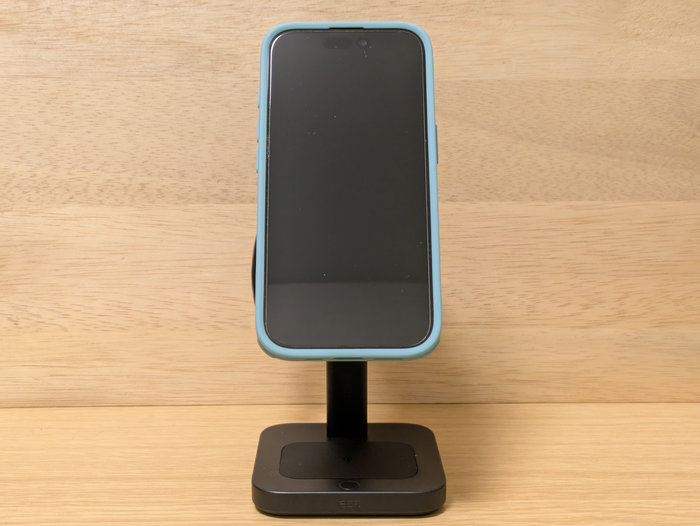 iPhoneを吸着するMagSafe部分は、強力な磁力でしっかりと固定されます。充電中に誤って触れても外れる心配はほとんどありません。また、iPhoneを縦向き・横向き(スタンドモード)へスムーズに回転できるため、通知の確認や動画視聴に非常に便利です。底面にはしっかりとした滑り止めがあり、デバイスの着脱時に本体が動くことはありませんでした。